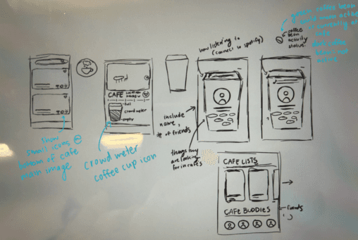 Sketches of search functionality, cafe screen, and profile sections